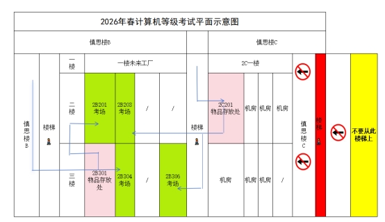 2.存放要求:所有与考试无关的物品,特别是手机、智能手表等电子数码产品,严禁带入考场。请考生将背包、手机等贵重物品及其他无关物品尽量存放在宿舍,避免带至考试区域。如确已携带,须先前往指定存放处(2C201和2B301)进行存放后,再前往考场参加考试。考试开始前及结束后,请统一从2B与2C之间的中间楼梯或靠近东大门的楼梯上下楼。